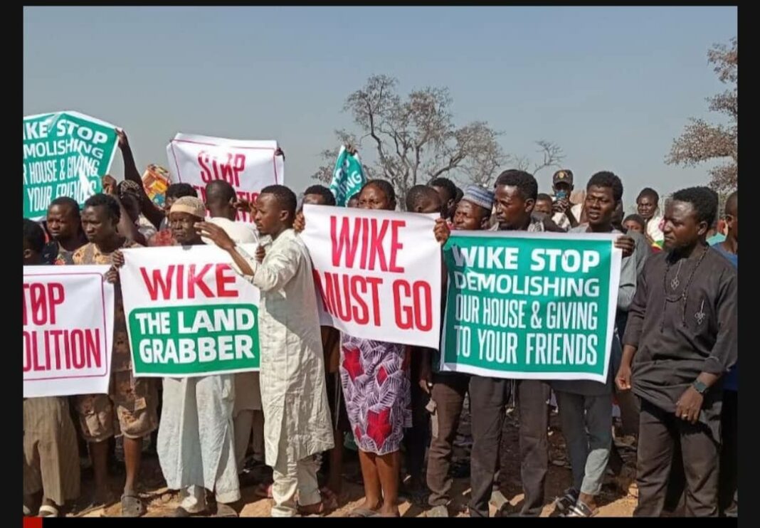 Some of the residents held placards various inscriptions, “Wike, stop demolishing our house and giving it to your friends,” “Stop demolitions,” and “Wike, the land grabber.”