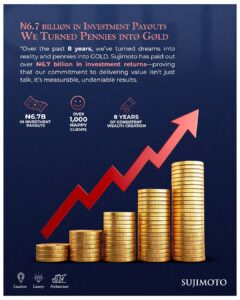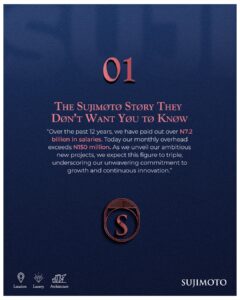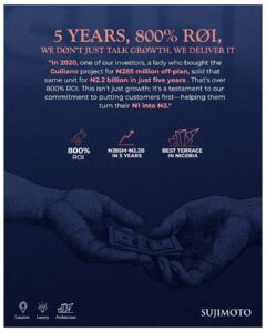 Sujimoto has not only built exceptional properties but also created immense value for its employees and investors. With a workforce supported by a current monthly overhead of over ₦150 million and salary disbursements totaling ₦7.2 billion over the last 12 years, our impact goes far beyond real estate. With the rollout of our ambitious new projects, we anticipate this figure to triple. This increase isn’t just about numbers—it’s a reflection of our continuous growth, innovation, and determination to push the limits of what’s possible, even in the face of adversity.