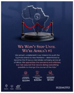 Criticism is inevitable when you dare to dream big. Despite the constant presence of doubters and naysayers, we remain unaffected. As we face each challenge head-on, we stay committed to our promise—to build the future of Nigeria’s real estate industry and beyond. Through it all, we will not back down. Sujimoto will rise, and we will continue to deliver on our promises— transforming the impossible into reality, one project at a time.