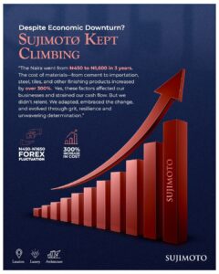 For most, these challenges would have been insurmountable. While many would have buckled under this pressure, we at Sujimoto Holdings chose to embrace the change, adapt and evolve. We achieved this through grit, resilience, and unwavering determination. Today, we are actively diversifying to support our cash flow and ensure we meet our obligations with urgency. With assets worth over ₦100 billion, we are also proudly constructing Nigeria’s tallest residential building, a landmark development worth over $220 million.