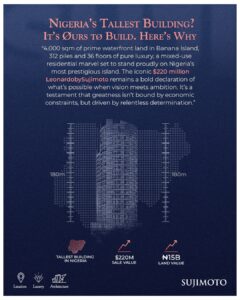 In the past eight years alone, Sujimoto has paid out over ₦6.7 billion in investment returns, a testament to our unwavering commitment to delivering measurable, undeniable results. The LeonardoBySujimoto, one of our most ambitious projects, aims to redefine luxury living. Located on 4,000 sqm of prime waterfront land in Banana Island, this $220 million mixed-use residential marvel will rise above 36 storeys, built upon 312 piles of pure luxury—an architectural feat that will stand proudly as the tallest one of Nigeria’s most prestigious landmarks.