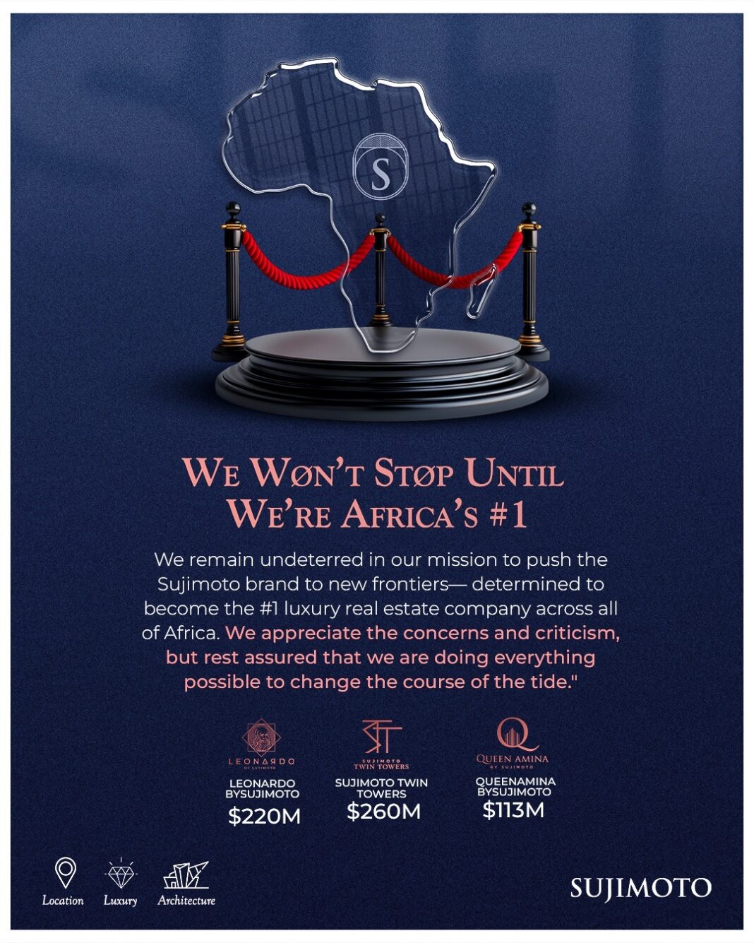 Criticism is inevitable when you dare to dream big. Despite the constant presence of doubters and naysayers, we remain unaffected. As we face each challenge head-on, we stay committed to our promise—to build the future of Nigeria’s real estate industry and beyond. Through it all, we will not back down. Sujimoto will rise, and we will continue to deliver on our promises— transforming the impossible into reality, one project at a time.